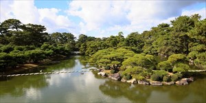 次に向かった丸亀市の中津万象園は1688年の京極二代目藩主により築庭された。京極家の先祖の近江八景を象っている。特に多くの矮松で見事な回遊式な大名庭園を成している。庭を配して新婚さんが前撮りをしていた。