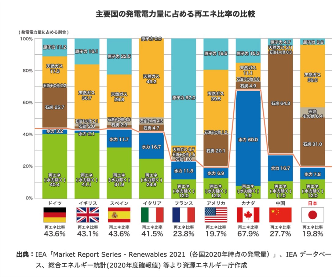スライドを見てください。これは資源エネルギー庁が出しているグラフですが、ヨーロッパやG7の国は再生可能エネルギーの率が軒並み40%を超えています。ここにはデンマークはありませんが、すでに70%、中国ですら30%を超えている。超えていないのは日本、フランス、アメリカの3カ国だけです。フランスは原子力を強力に進めているので、化石燃料は10%たらず、アメリカはシェールガスや石油などもある産油国です。日本は様々な点でアメリカ追随であることが多いのですが、エネルギーのない国である私たちがアメリカの真似をする意味はありません。