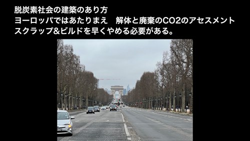 デンマーク全体ではすでに70%以上が再生可能エネルギーとなっていて、その首都コペンハーゲンでは2030年に脱炭素になる目標が建てられています。その原動力となっているのが、70mの高さのあるコペンヒルというごみ焼却場で、ここでゴミを燃やしながら、発電と熱を発生させ、全市に配るという仕組みを進めています。屋上はスキー場などのレクリエーション施設になっています。建築はライフサイクル全体でのCO2削減を目指していることから、古い建物の材料の再利用などが盛んで、まるで洋服でいう古着のようなスタイルの集合住宅が人気です。デンマークは2010年ごろから急速に再エネを導入していくのですが、そのベースにあるのは、建物の高断熱化で、日本で今年義務化されたレベルはすでに30年くらい昔のレベルです。デンマークでは石油ショック以来、少しずつ規制を強化して、日本の1/5の省エネルギーの効果を持っています。