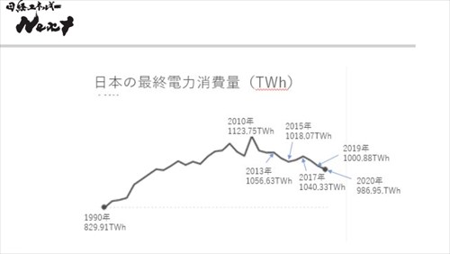 日本ではここ10年で消費電力量が12%ほど減っています。これは家庭用の太陽光発電が普及してきたことで、その消費量を減らしているのです。日本も知らない間に変化し続けています。