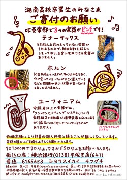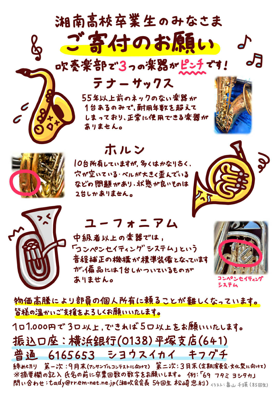 湘吹会 (湘南高校吹奏楽部OB・OG会) では、吹奏楽部保有楽器の老朽化に伴う代替楽器購入のための募金を行っています。募金を行う背景等は以下のとおりですが、今回は湘友会会員の皆様にも広くご協力をお願いすることとしました。添付のチラシをご高覧のうえ、ご協力を賜りますようよろしくお願い申し上げます。