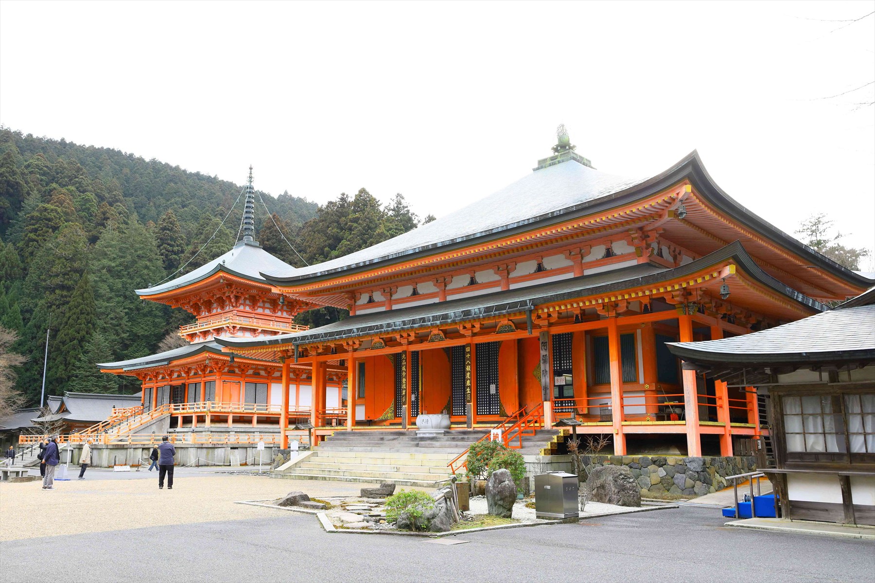 「弁慶のにない堂」とも云われる、常行堂・法華堂や釈迦堂などを巡れば、いずれも朱色の建物が緑の杉木立に映える。石段もあり齢を考えると些か難行と感じるが、しっかり手すりに捕まって下る場面もあった。