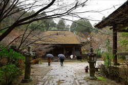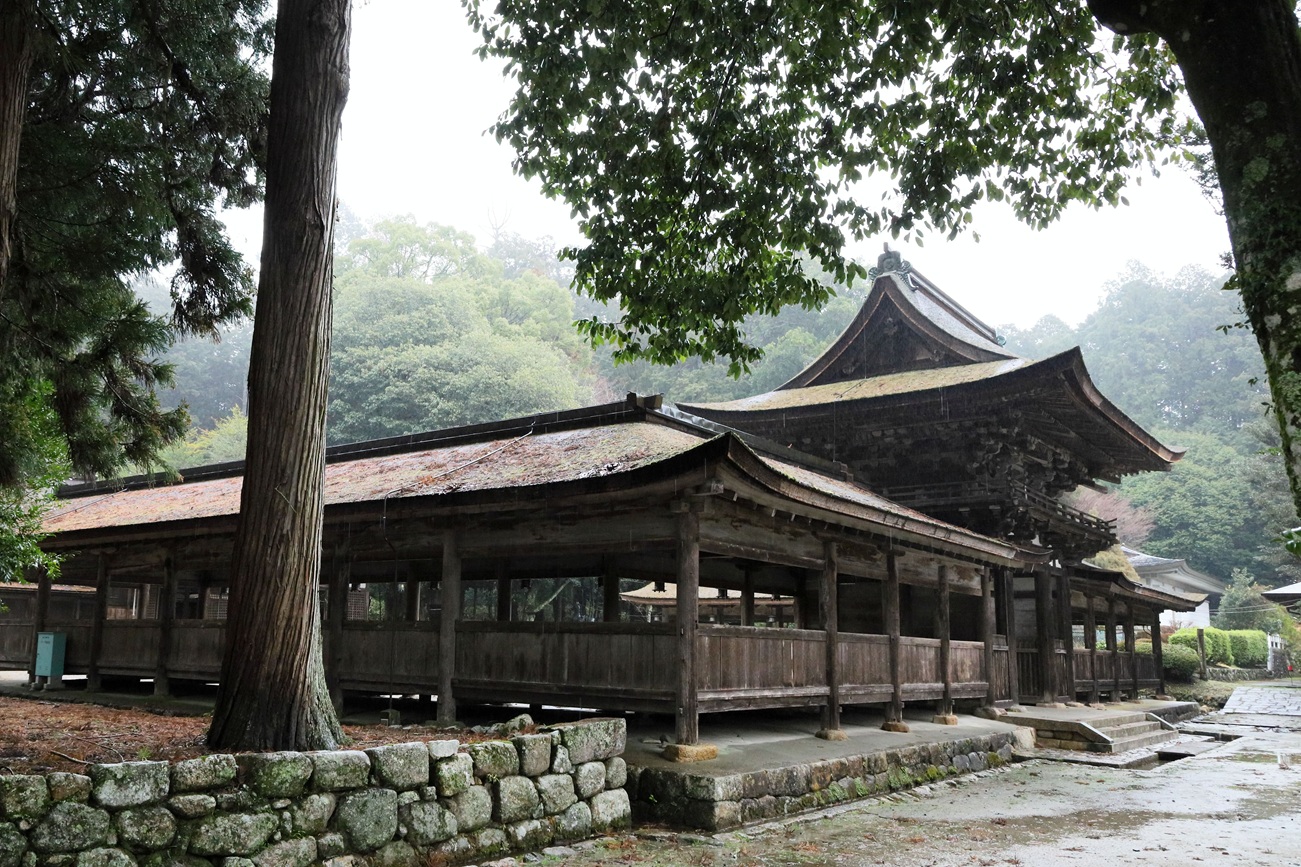 次は善水寺を訪ねた。この寺も本堂は国宝に指定されている。檜皮葺の屋根替えを終えたばかりで、雨の中でも真新しく色鮮やかに映える。住職のお話を拝聴すれば、秘仏本尊は薬師如来、その脇仏も多く、更に戒壇の裏側にも何体もの仏さんが置かれていた。そのいくつかが「旧国宝」と紙片が貼られていた。住職はとても忙しそうで次の祈祷へ走って行かれたので、その意味を知ることはできなかった。本堂横の池の畔には善水元水があり、これを口にすればご利益があるとか云われている。