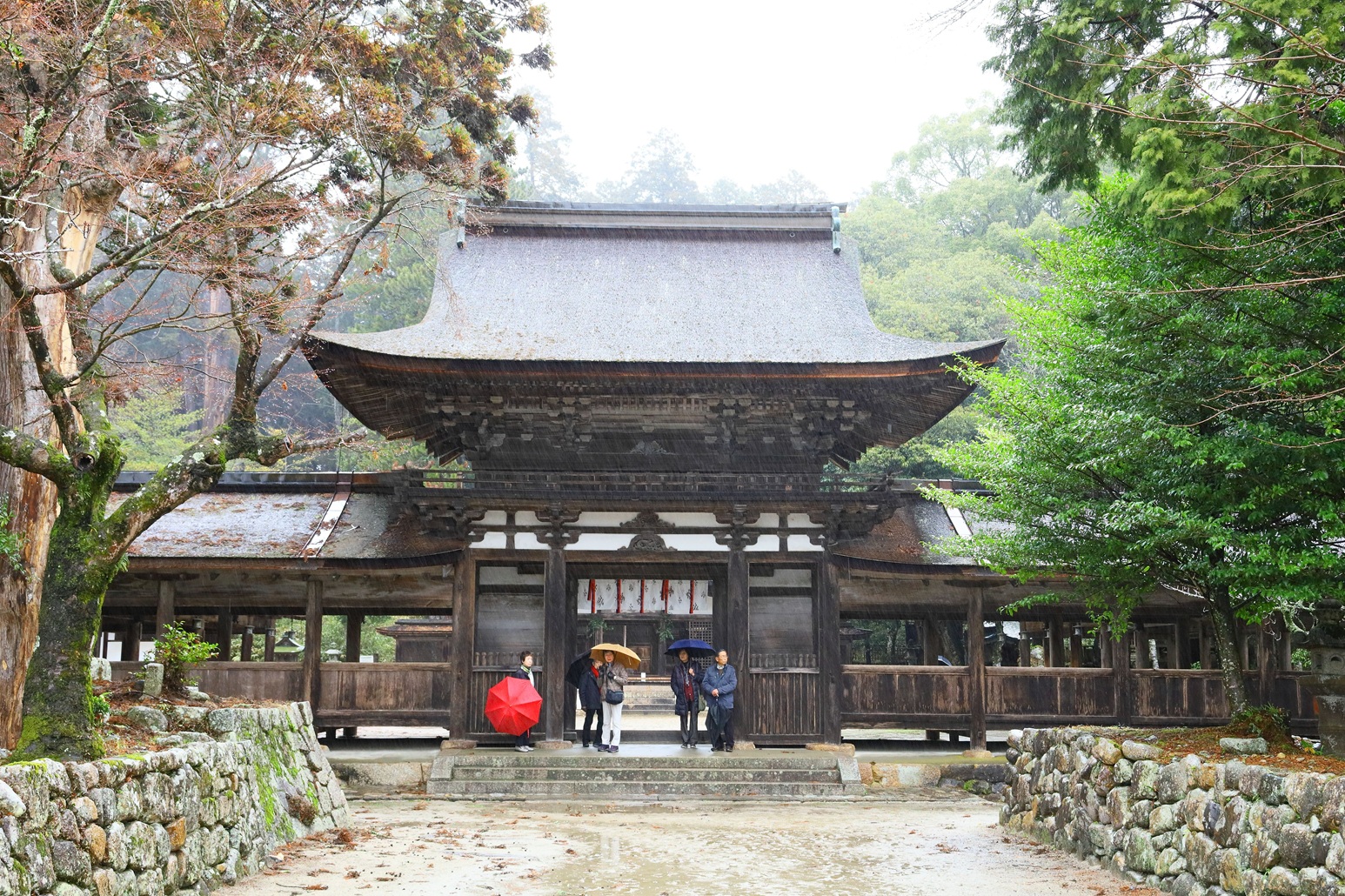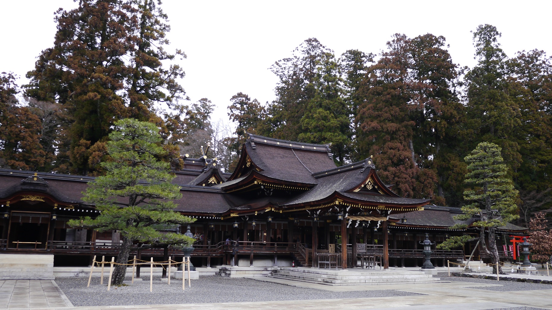 秀吉所縁の太閤橋を過ぎて広々とした境内に入れば、ようやく雨も上がる。中央の社殿は緑の森を背景に、左右の回廊が翼にように広がる。巫女が回廊を走り、社殿では若い二人が御祈祷を受けている。